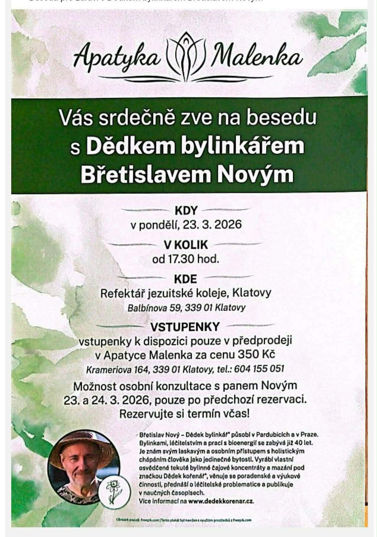 V barokní lékárně U Bílého jednorožce v Klatovech přednáší Vladimíra Naušová, terapeutka. Vstupné: 100 Kč (Zapsal: Vlastivědné muzeum Dr. Hostaše, 16.02.26) | ||