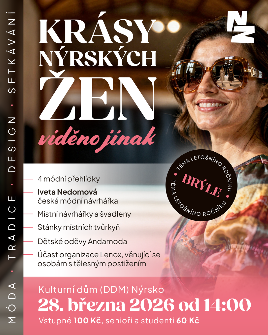 Komunitní módní přehlídky místních návrhářek a švadlen i oživení tradičního modrotisku spojeného s historií Nýrska. Vrcholem programu bude komentovaná přehlídka české módní návrhářky Ivety Nedomové. Součástí akce jsou stánky místních tvůrkyň, fotokoutek s brýlemi a další, v KD (DDM) Nýrsko. Krásy nýrských žen: Viděno jinak jsou komunitní módní a společenskou akcí, která propojuje místní tvorbu, tradici, současný design a setkávání lidí napříč generacemi. Akce navazuje na úspěšný první ročník a reaguje na zájem veřejnosti o pokračování podobných formátů, které dávají prostor ženám, kreativitě a neformálnímu sdílení. Hlavní program tvoří čtyři módní přehlídky. Tři z nich představí kolekce místních návrhářek, švadlen a podnikatelek, včetně přehlídky zaměřené na tradiční techniku modrotisku, která má v Nýrsku historickou vazbu a chceme ji znovu připomenout v současném kontextu. Modely na mole předvedou místní dobrovolnice a dobrovolníci všech věkových kategorií – od dětí až po seniorky. Vrchol programu obstará Iveta Nedomová, česká módní návrhářka zaměřená na udržitelný a nadčasový design. Součástí jejího vystoupení bude nejen módní přehlídka, ale také krátká přednáška, diskuze s publikem a odborný komentář. Letošním tématem akce jsou brýle – jako módní doplněk, symbol pohledu, identity a způsobu, jak se díváme na sebe i své okolí. Téma se promítne do programu i doprovodných aktivit, včetně tematického fotokoutku. Po celou dobu akce budou probíhat workshopy a prezentace místních živnostnic, například v oblasti módy, ruční výroby, kosmetiky či doplňků. Vstupné je 100,- a pro seniory a studenty 60,-. (Zapsal: Nýrsko ŽIJE, 02.02.26) | ||