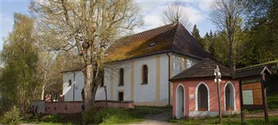 Kostel charakteristický svým šindelovým pokrytím postavený v letech 1824 – 1826 na místě dřevěné kaple Panny Marie Růžencové, která zde stávala od roku 1761.