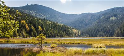 Kolem jezera vede okružní turistická stezka. Výhled na Velký Javor. Hostinec Seehäusl.