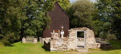 Zaniklá šumavská osada, obnovená hřbitovní kaple a torzo kostela, zvon smíření.