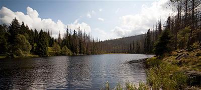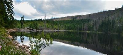 Jezero ledovcového původu pod Vrcholem Velkého Javoru, turistická cesta kolem jezera.